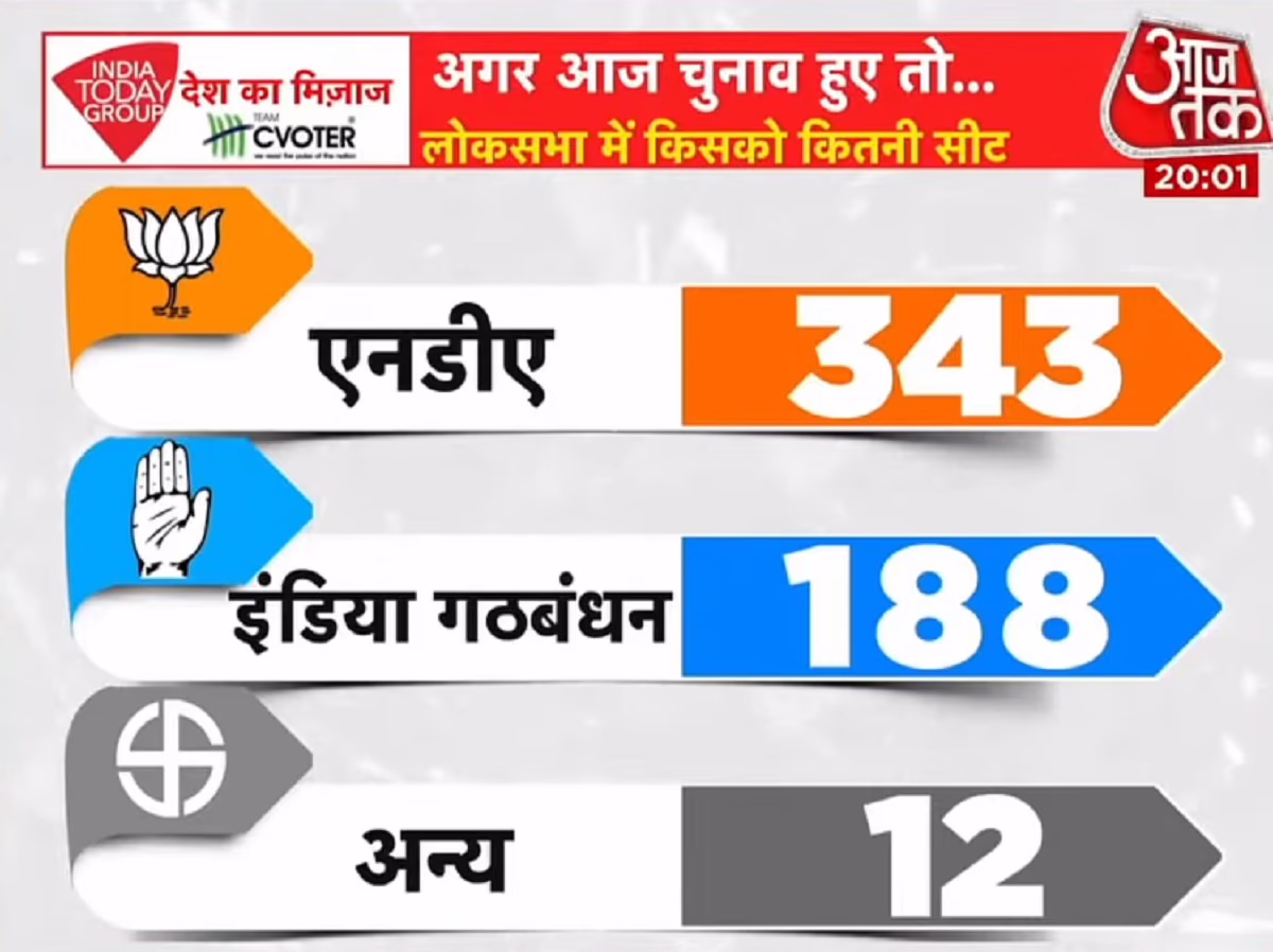The India Today Group in collaboration with C-Voter presented the comprehensive Mood of the Nation (MOTN) survey, encompassing the voices of over 125,123 individuals from diverse age groups, income brackets, education levels, castes, and urban-rural demographics. According to the MOTN survey’s projections, if the Lok Sabha elections were held today, the BJP is poised to secure 281 seats, while the Congress may clinch 78 seats. In the 2024 Lok Sabha elections, Congress was awarded 99 seats, indicating a declining trajectory. MOTN estimates forecast a commanding 343 seats for the NDA coalition and 188 seats for the India Block if elections were imminent.