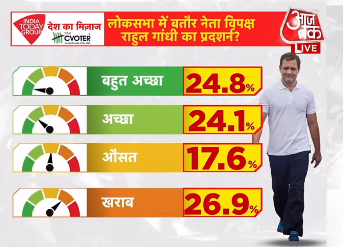 The Mood of the Nation survey investigated Rahul Gandhi’s performance as Leader of Opposition in Lok Sabha, with 24.8% rating it highly, contrasted with 26.9% who viewed it unfavorably.