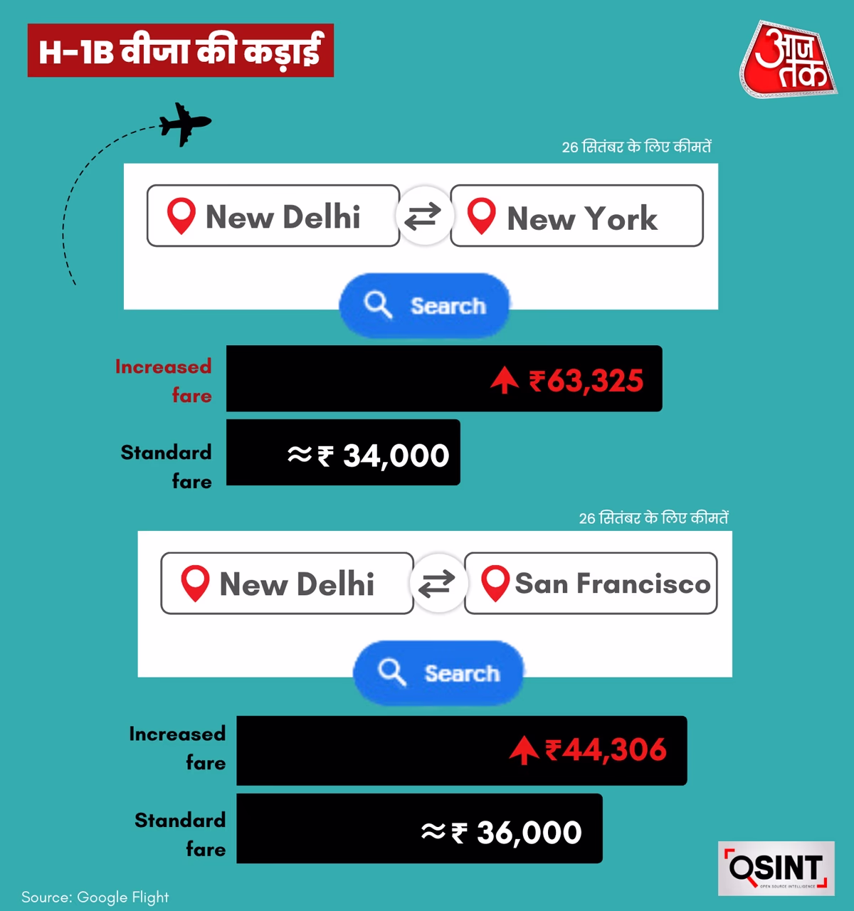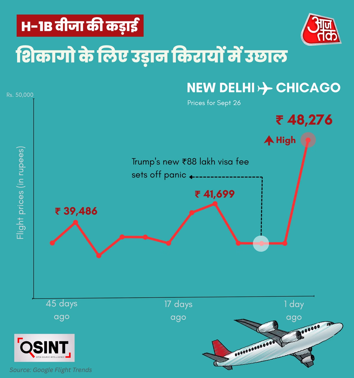 Last-minute ticket bookings led to sudden airfare hikes from Indian cities like Delhi and Mumbai to New York, Newark, Chicago, and San Francisco. An analysis by India Today's OSINT team of Google Flights data revealed that tickets on the Delhi to Chicago route surged from ₹35,000 to ₹48,276, while from Mumbai, it spiked to ₹49,076.