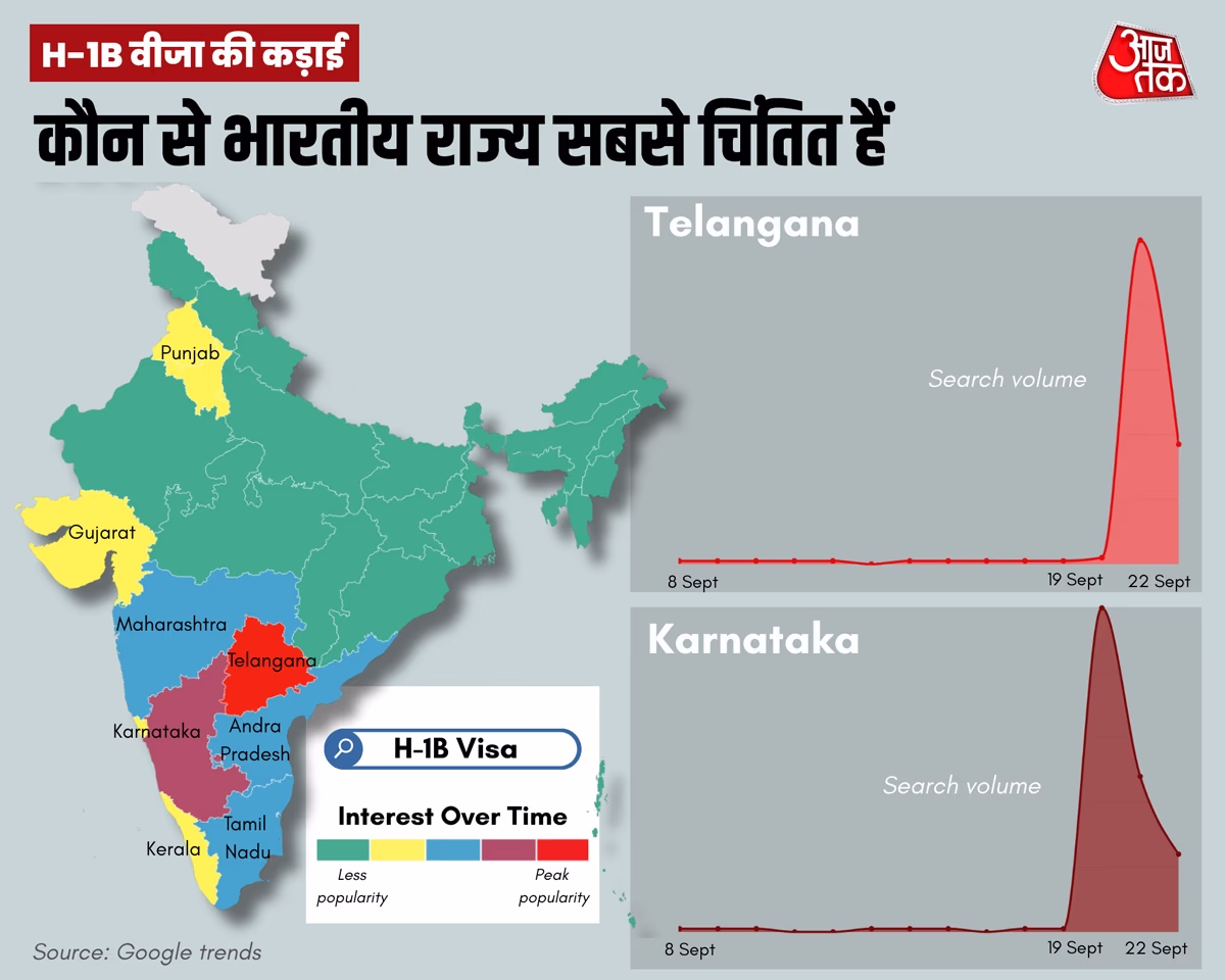 Families of H-1B visa holders in India are also tense. Google search data indicates a sudden spike in keywords related to H-1B. This trend mostly emerged from Telangana, Karnataka, Tamil Nadu, Andhra Pradesh, and Maharashtra.