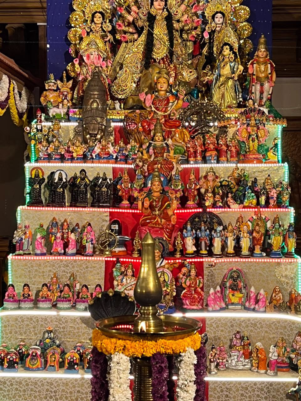 After photographing Golu displays, I continued my exploration. Yet another temple emerged along my route. This time, I saw a five-stepped Golu exhibit. It became apparent that Golu displays were predominantly temple-associated, with people visiting these locales to view the exhibits.