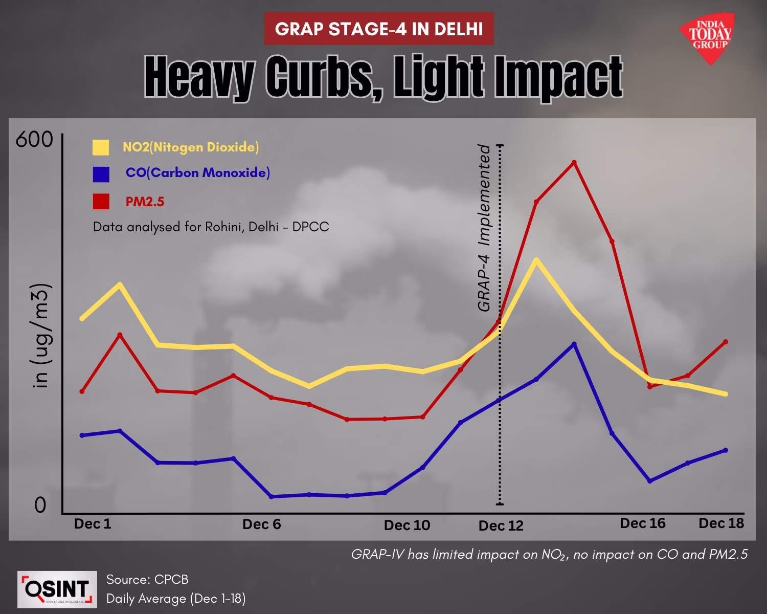 Under GRAP Stage-IV, construction and demolition activities in Delhi were completely halted, open burning of waste and biomass was banned, entry of non-BS VI vehicles registered in other states was restricted, fuel was not provided to vehicles without a valid Pollution Under Control certificate, and work-from-home became mandatory for 50% of employees in government and private offices. However, despite stringent measures on paper, their impact on ground reality was limited.