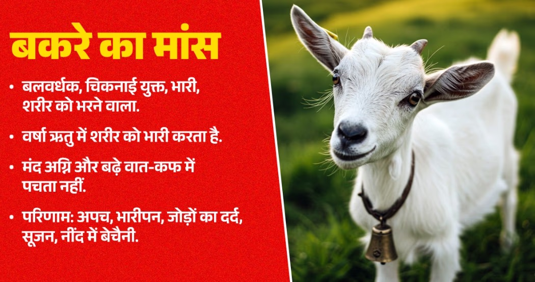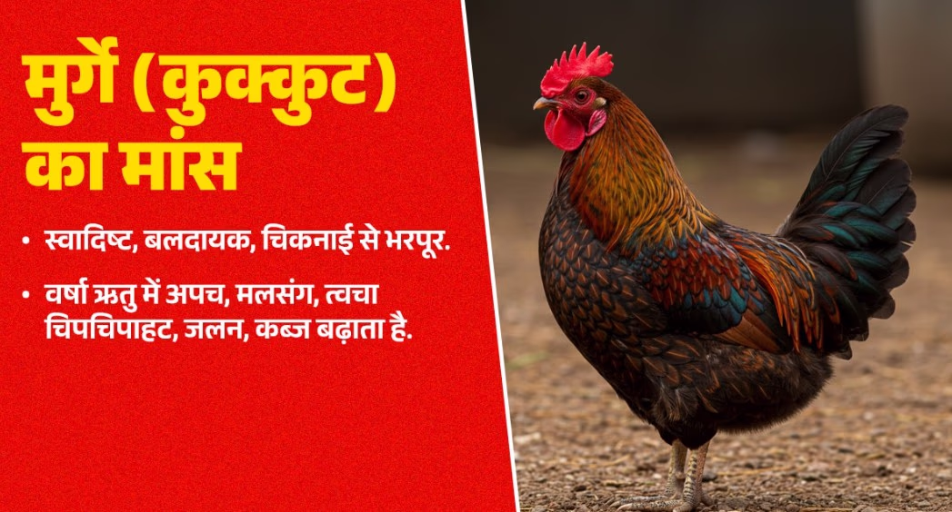 Meat like goat is heavy and nourishing yet detrimental in this season due to potential indigestion, joint pain, swelling, and restlessness. Similarly, chicken, although nourishing, can exacerbate indigestion, sticky skin issues, and constipation.