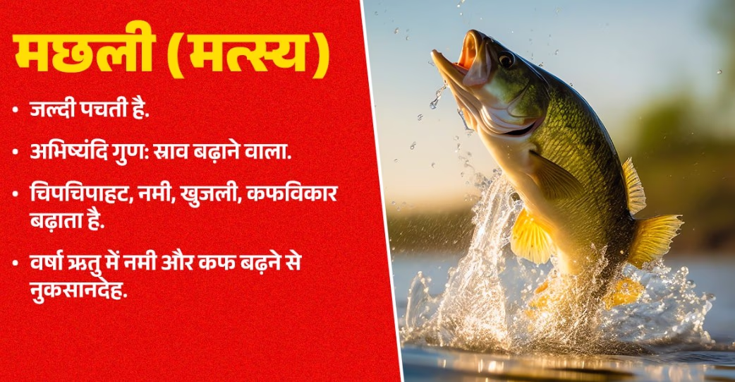 Consuming fish during the monsoon poses risks; despite its easy preparation, its innate qualities heighten stickiness and kapha-related disorders, already prevalent in the rainy season.