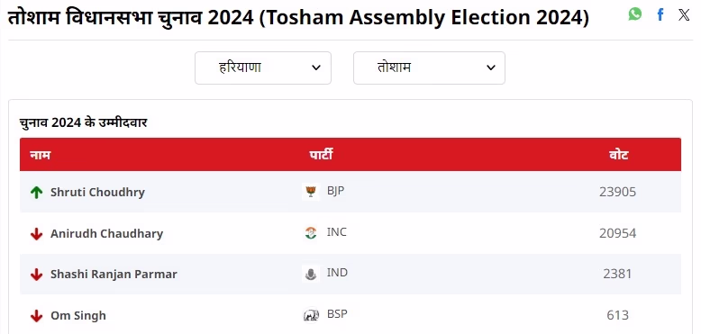 As the outcomes of the Haryana legislative elections begin to unfold, the vote tallying is underway for the much-talked-about Tosham seat. Currently, BJP's Shruti Chaudhary has a lead of 2,610 votes against Congress's Anirudh Chaudhary, having secured a total of 32,816 votes. Tosham is noteworthy for the presence of Virender Sehwag, the legendary cricketer, who advocated for Anirudh Chaudhary.