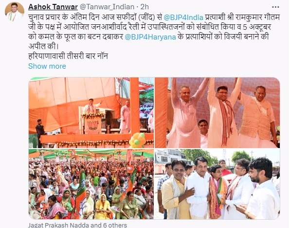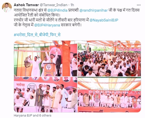 Illustrating his former dedication to the party, Ashok Tanwar had earlier posted images from a rally in support of BJP candidate Randhir Panihar from the Nalwa assembly area, exuding confidence in BJP's continued governance under Naib Singh Saini's leadership.