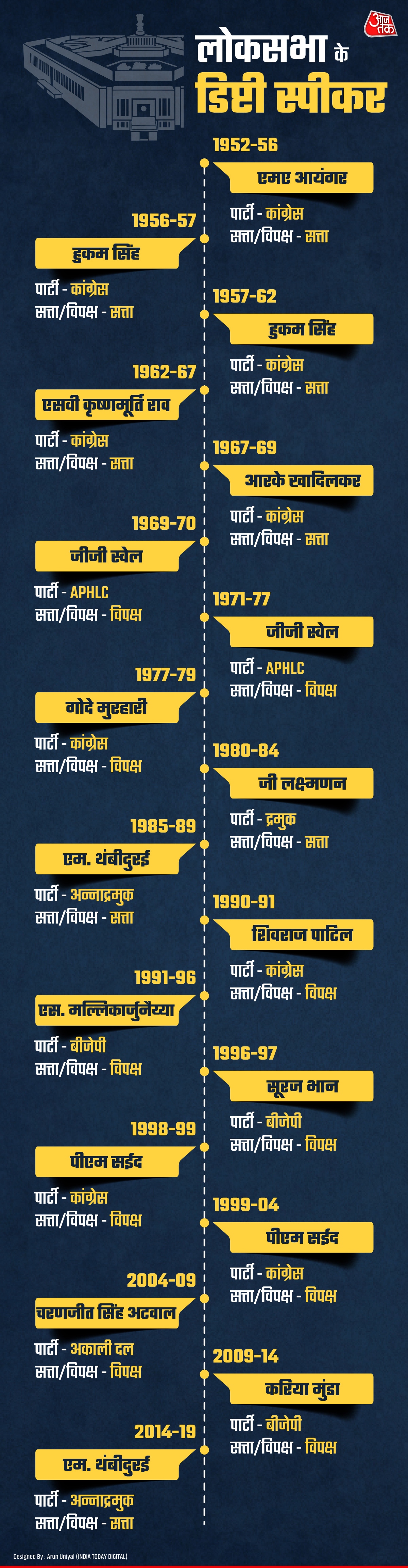 From 1990 until 2014, each term witnessed the opposition holding the Deputy Speaker's chair. In 2014, when Modi's government came into power for the first time, M. Thambidurai of AIADMK was elected Deputy Speaker, an NDA constituent at that time.