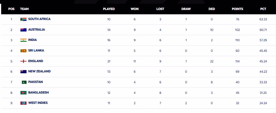 Meanwhile, Australia has slid to second place, having gained 102 points through 9 wins, 4 losses, and 1 draw over 14 matches, leaving them with a percentage of 60.71. India, currently in third position, secured 110 points from 16 matches, holding 9 wins, 6 losses, and 1 draw, with a percentage of 57.29. India is scheduled to play three more matches against Australia in this cycle.