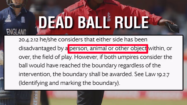 If the umpire believes an individual, animal, or any object has entered the field (field of play) and caused detriment to a team, the ball is declared dead. However, if both umpires agree that the ball would have reached the boundary anyway, a boundary is awarded.