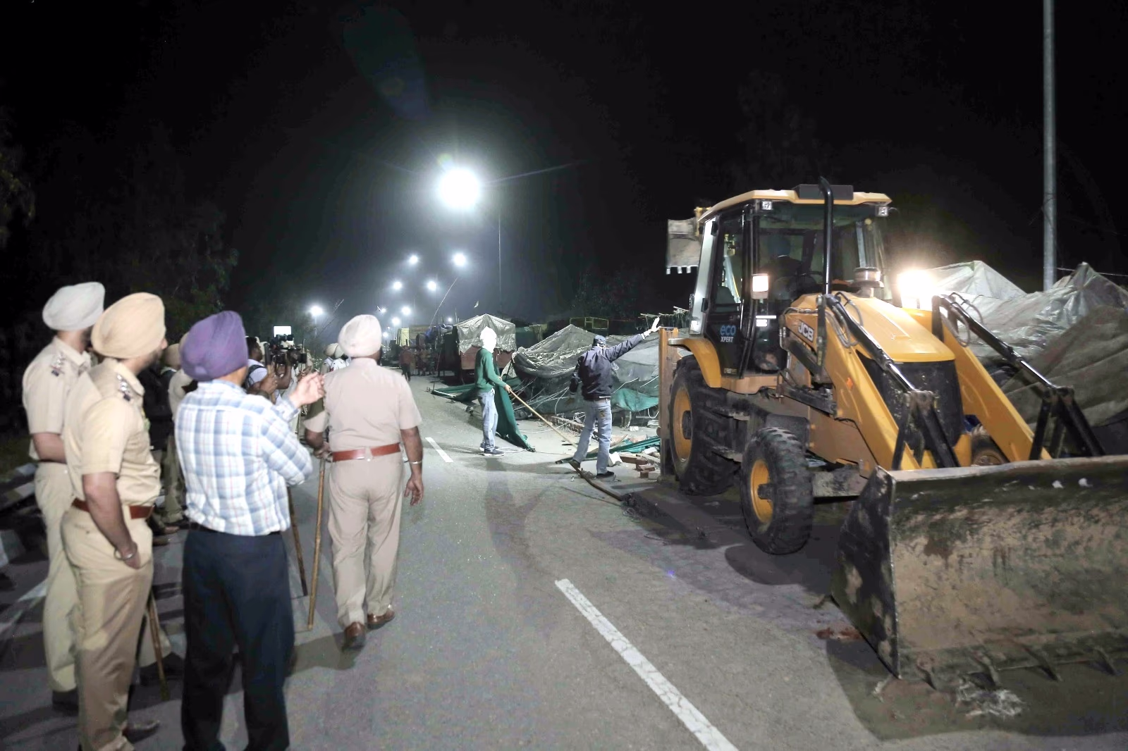 Bulldozers were used to dismantle farmers' sheds in Punjab. Initially, farmer leaders Sarwan Pandher and Jagjit Dallewal were detained by police. Subsequently, Punjab Police cleared the Shambhu and Khanouri borders. The operation by Punjab Police lasted several hours, resulting in the detention of over 700 farmers. Later that night, the removal of cement barricades from Haryana side commenced, as Haryana Police used bulldozers to remove concrete barricades at the Haryana-Punjab Shambhu border to restrict farmers' movements.