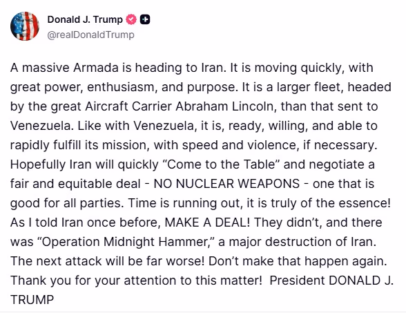 Trump announced that a formidable U.S. naval fleet is advancing towards Iran, led with power, enthusiasm, and clarity of mission. This convoy, spearheaded by the colossal USS Abraham Lincoln, surpasses the fleet previously dispatched to Venezuela.