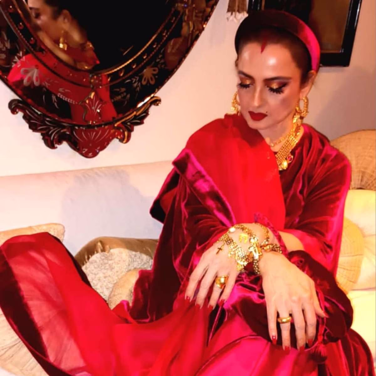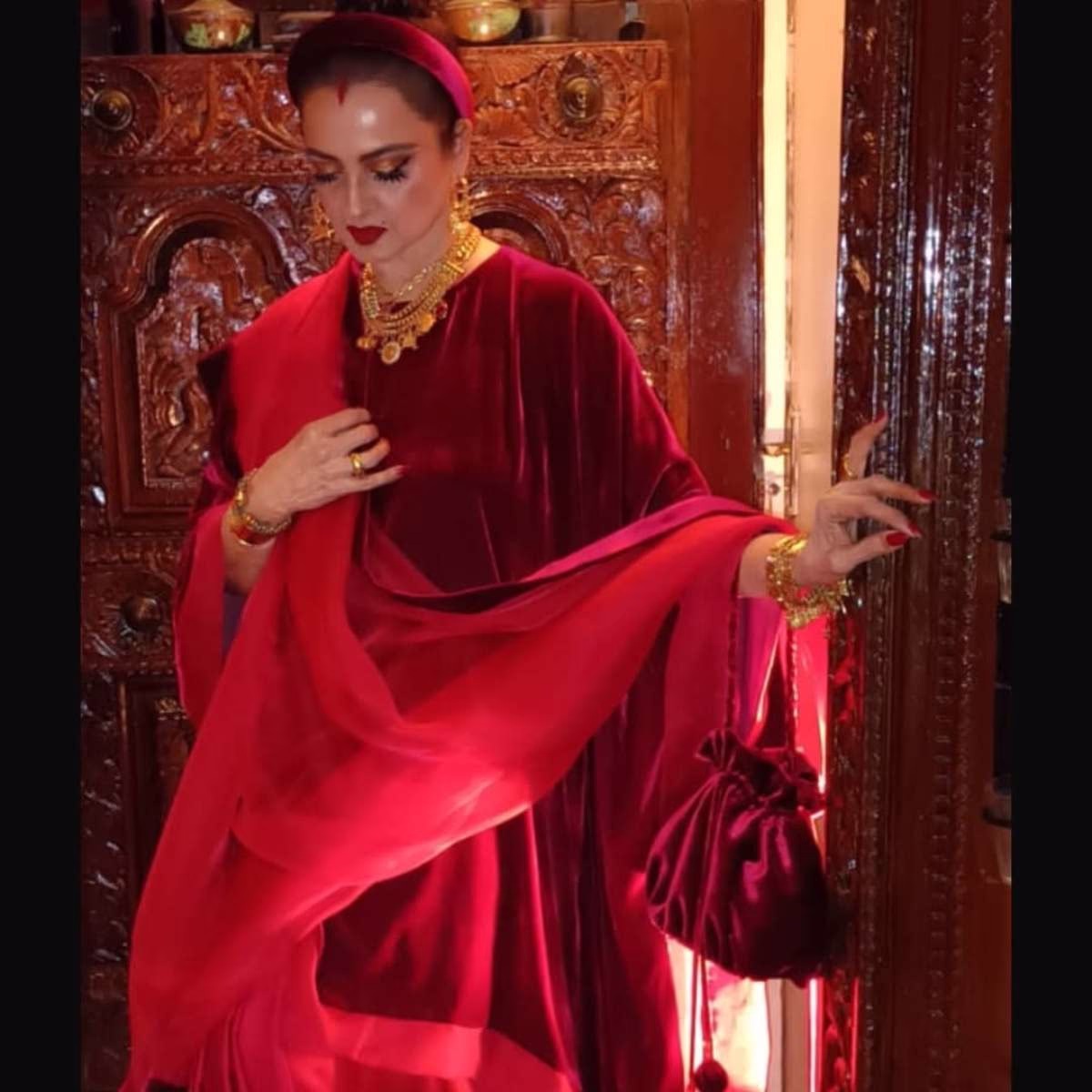 Rekha graces the Christmas occasion with traditional and royal charm, looking exceptionally beautiful in red and Bordeaux hues. Fans are showering immense love on these stunning photographs.