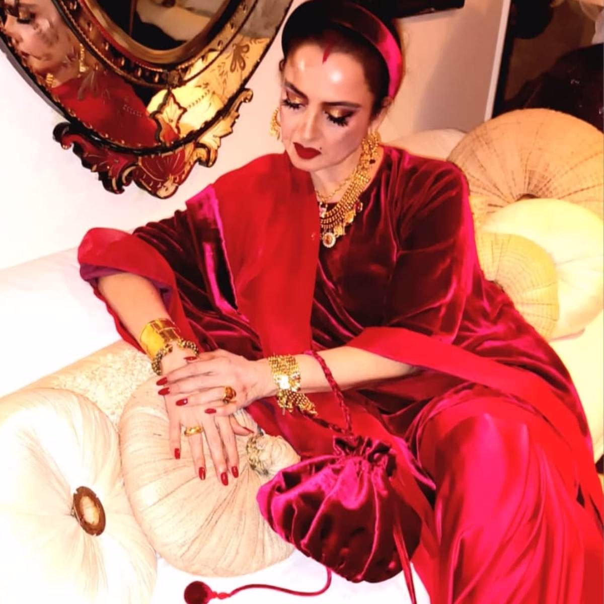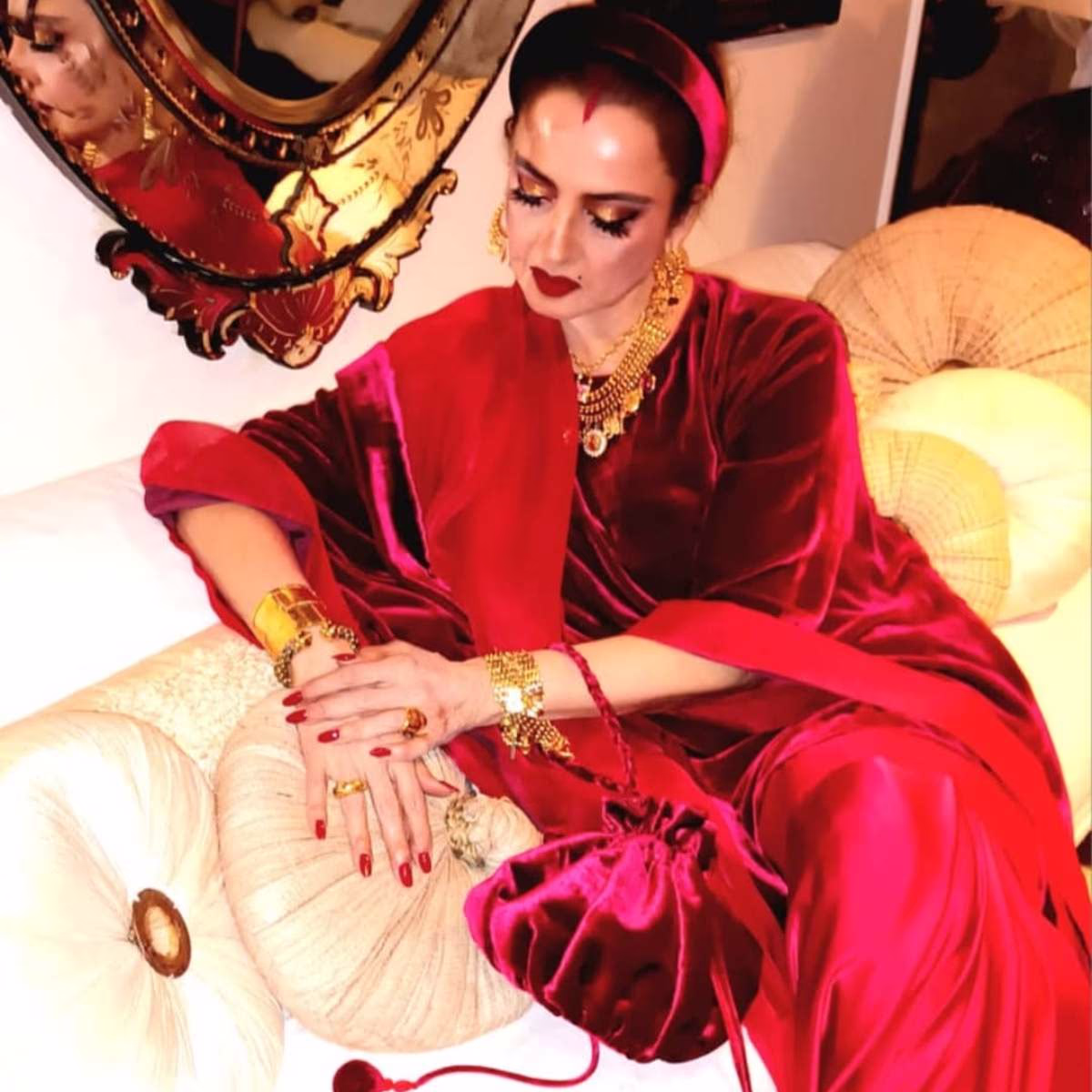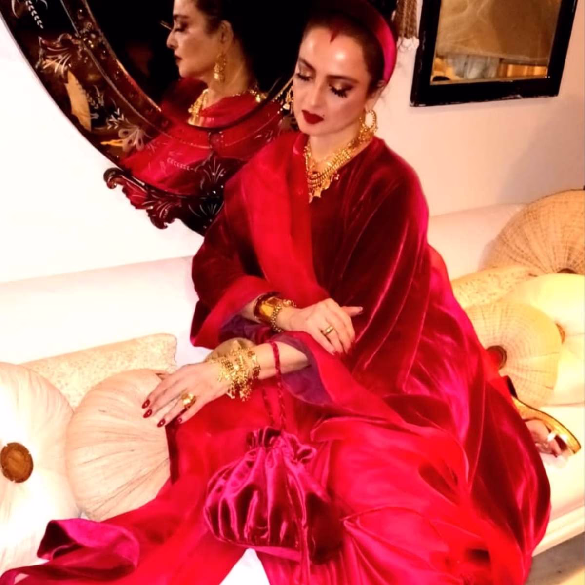 To complete her look, Rekha carries a matching 'MM Velvet Batwa'. The deep red batwa and her earrings add a classic vintage touch to her overall appearance.
