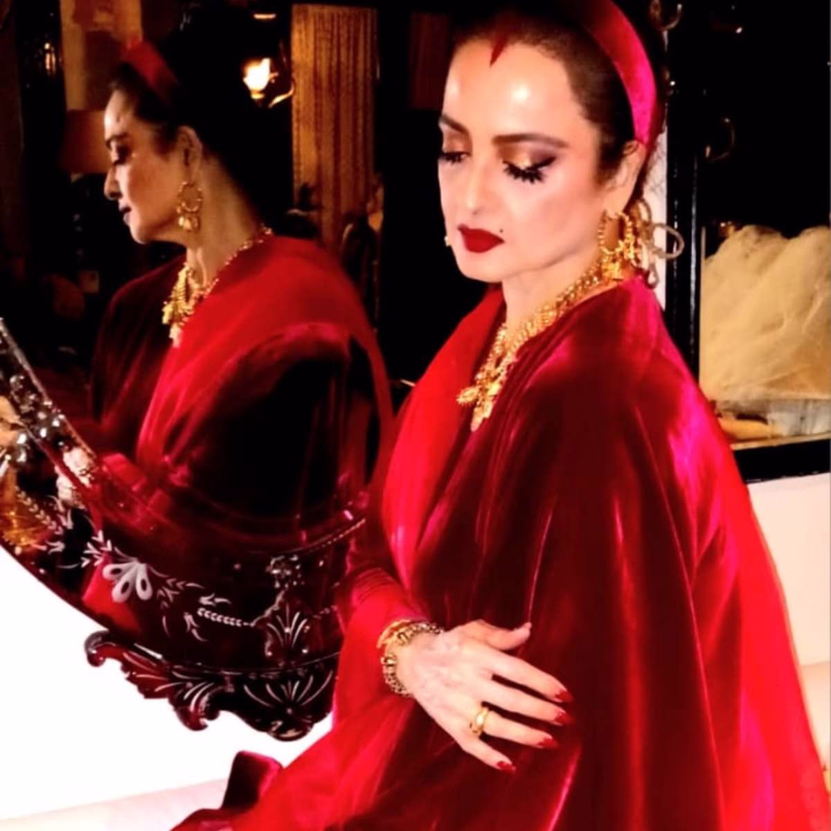 Sharing these captivating photos, Manish Malhotra writes, 'The combination of reds and Bordeaux with exquisite fabrics celebrates the spirit of Christmas. Rekha, truly in the holiday spirit, looks breathtaking.'