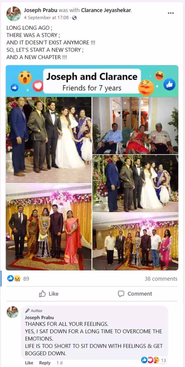 Joseph penned, 'There once was a story, but it is no more. Let's write a new story, and a new chapter.' This post, shared in 2022, reflected on an old memory with a friend which included wedding photos of Samantha and Chaitanya. The post's viral nature prompted Joseph to thank people for their feelings, adding, 'Thank you for your feelings. Yes, I’ve been sitting for a long time to let my feelings subside. Life is too short to sit with these feelings and let them weigh you down.'