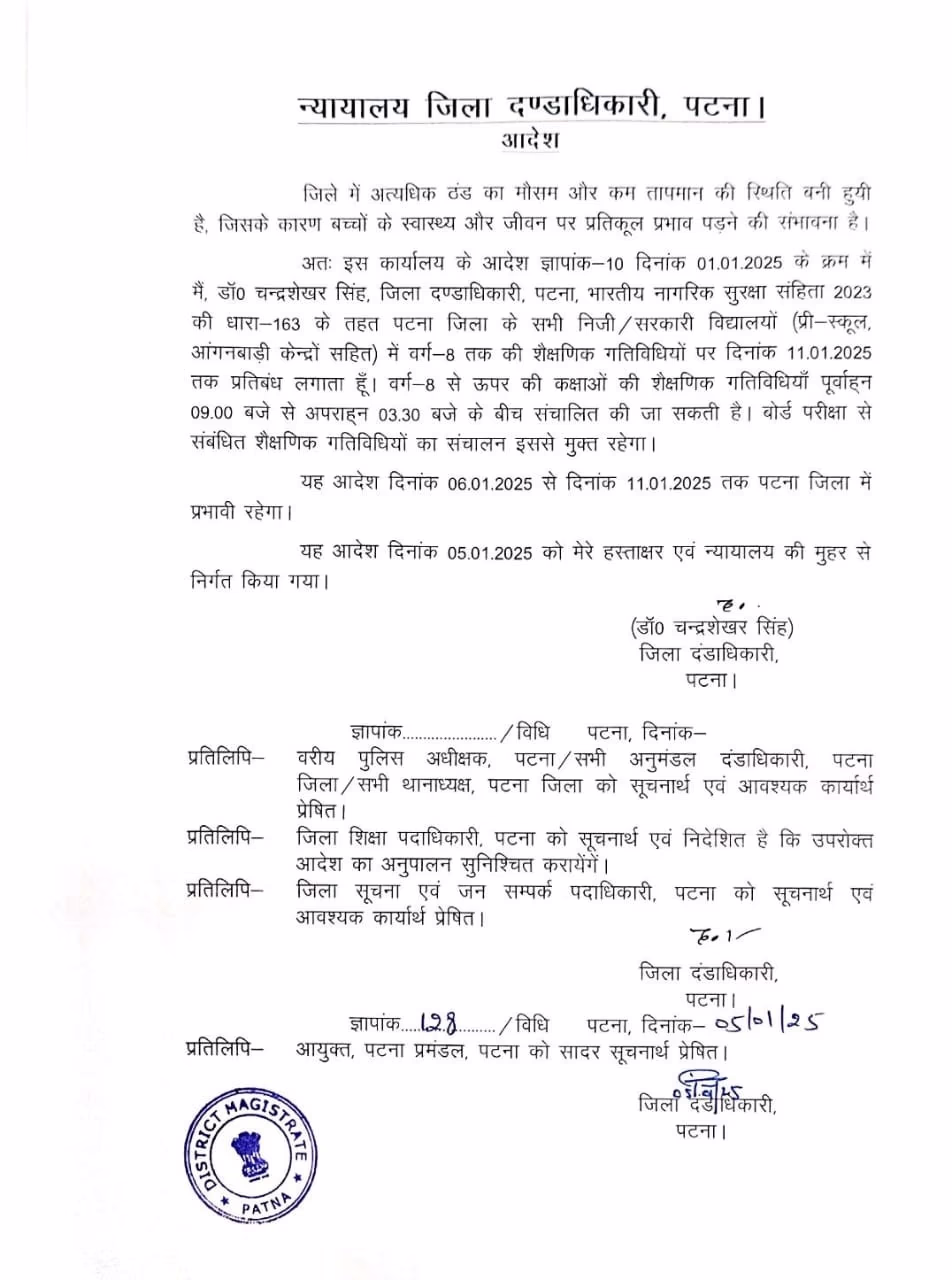 According to an order issued by Patna's DM Dr. Chandrashekhar Singh, the closure applies to all government and private schools, including preschools and Anganwadi centers, up to class 8. However, teachers are required to report to school at their scheduled times. This measure aims to protect children from the adverse effects of the cold while ensuring that school administrative activities continue.