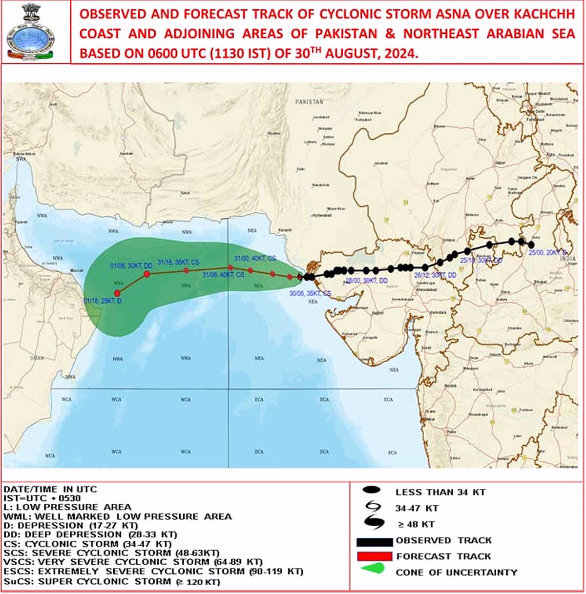 Currently, Cyclone Asna is located 170 kilometers west of Naliya in Gujarat, 160 kilometers south of Karachi in Pakistan, and 430 kilometers east-southeast of Pasni in Pakistan.