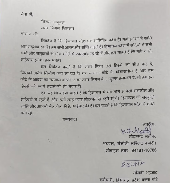 A delegation from the committee handed a memorandum to Municipal Commissioner Bhupender Atri, stating that the Muslims residing in the area are permanent residents of Himachal Pradesh and that this step is being taken to maintain harmony and brotherhood. Committee member Mufti Mohammad Shafi Qasmi stated, "We have sought permission from the Shimla Municipal Commissioner to demolish the unauthorized section of the mosque located in Sanjauli."