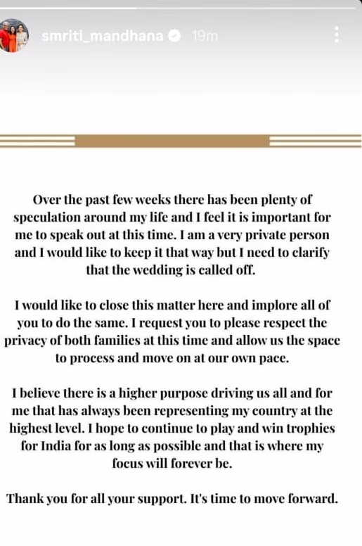 On Instagram, Mandhana expressed, 'For the past few weeks, there have been numerous discussions about my life. I am a private person and prefer to keep my personal life personal, but it's now important to confirm that the marriage has been canceled. I hope this matter concludes here. I request everyone to respect the privacy of both families and give us time to overcome this situation and move forward.'