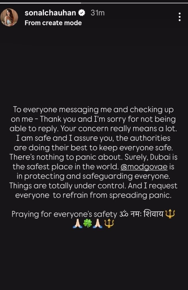 The actress further added, 'Indeed, Dubai remains one of the safest places. The Ministry of Defence is actively ensuring everyone’s protection. Everything is under control, and I urge everyone not to spread panic. Let's pray for everyone's safety. ॐ नमः शिवाय.'