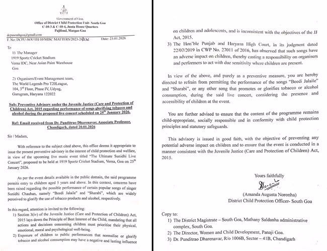 A significant news has emerged just before renowned singer Sunidhi Chauhan's live concert in Goa. The state's Child Protection Unit has released a stringent advisory for the organizers, explicitly instructing them not to perform songs that promote vices such as tobacco, smoking, or alcohol during the concert.