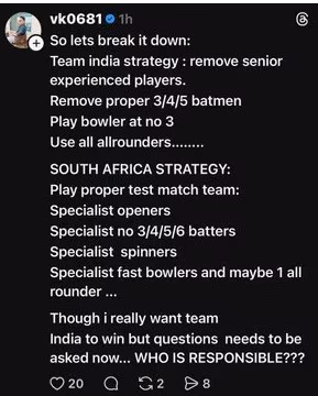 He articulated, 'Team India's Strategy - Oust senior players, remove genuine batsmen for positions 3/4/5, deploy bowlers at number 3, fill the team with all-rounders only... South Africa's Strategy - Specialist opener, specialist middle-order, specialist spinner, specialist fast bowler... and just one all-rounder.'