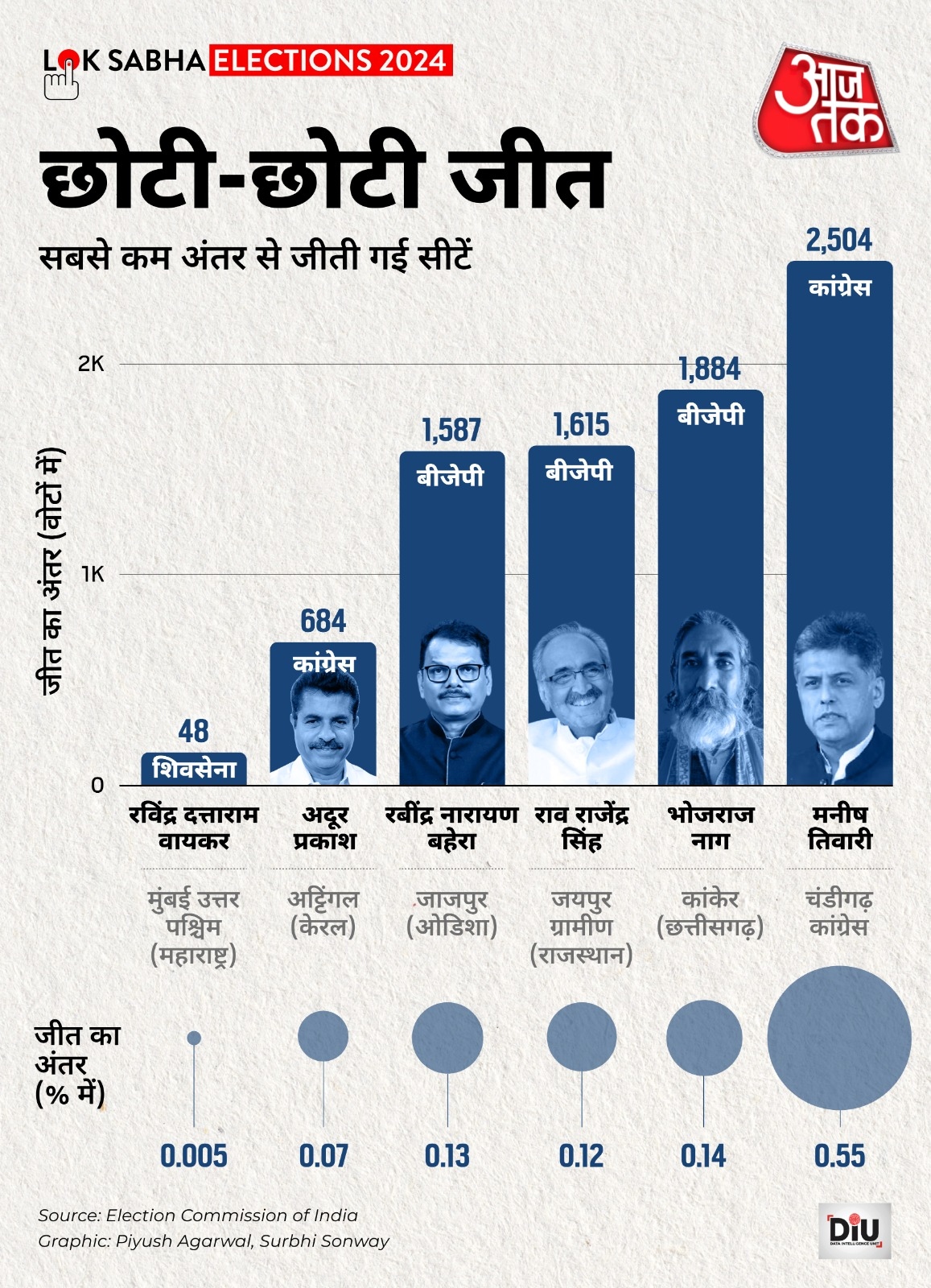 In this election, the candidate from Shiv Sena (Shinde faction), Ravindra Waikar, claimed the narrowest margin of victory by defeating Shiv Sena (Thackeray faction)'s candidate Amol Gajanan Kirtikar by just 48 votes in Mumbai North-West.