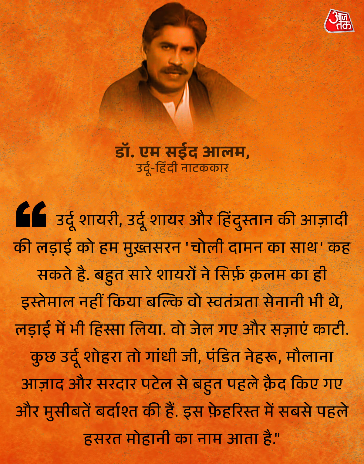 Theatre director and Urdu-Hindi playwright Dr. M. Saeed Alam told 'aajtak.in': “We can succinctly say that Urdu poetry, Urdu poets, and the Indian freedom struggle go hand in hand. Many Urdu poets not only wielded their pens but also participated as freedom fighters. They were imprisoned, and some faced severe punishments. Among them, the name Hasrat Mohani stands out, who coined the slogan 'Inquilab Zindabad' (Long Live the Revolution). He faced prison multiple times and endured great hardships, which inspired a famous sher (couplet) of his.”