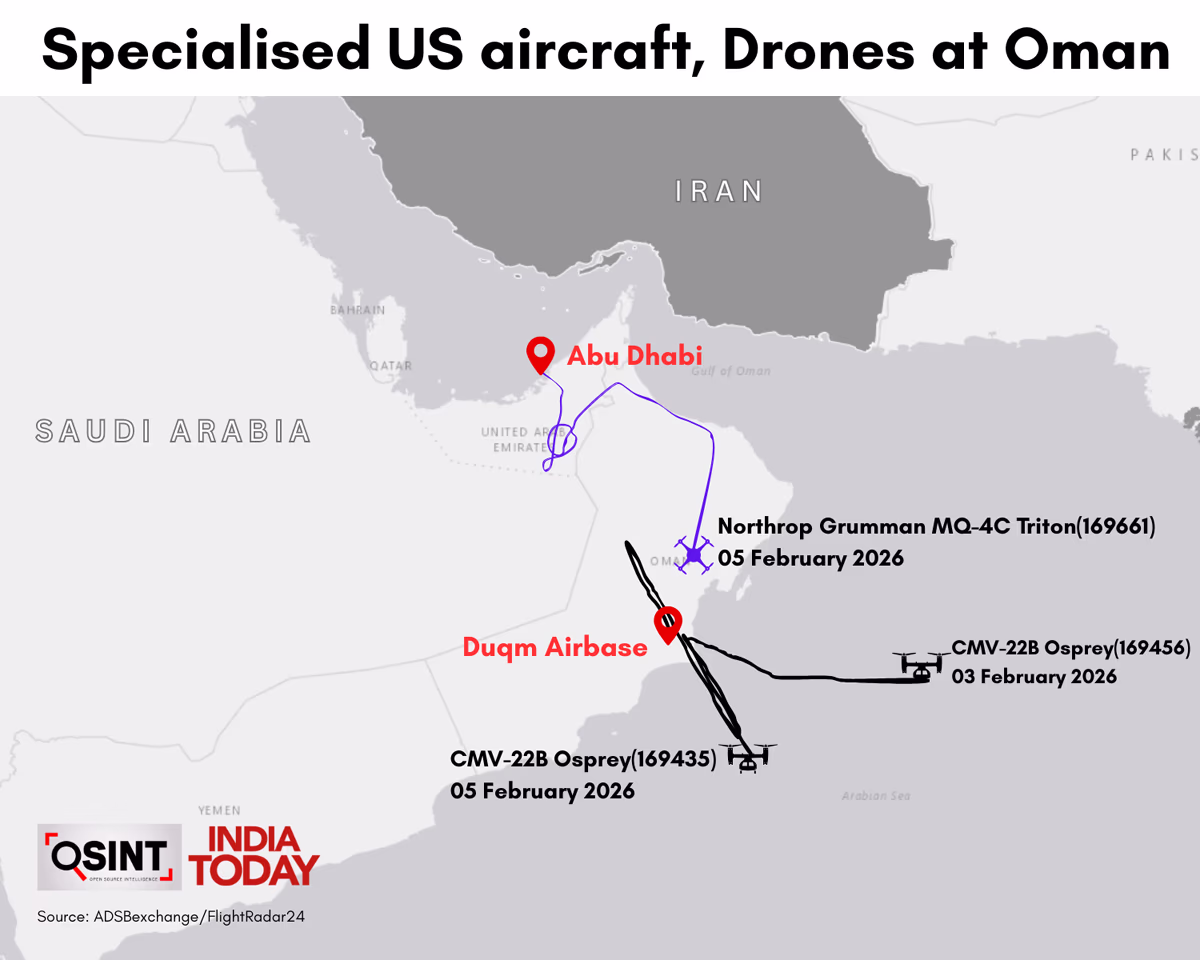 India Today tracked activities of specialized drones and Osprey supply aircraft at Oman’s Duqm Air Base through open-source flight tracking data. Since early January, two Bombardier E-11A aircraft (tail numbers 23-9048 and 21-9045) were already stationed in the region. This week, another E-11A (tail number 12-9506) arrived from Chania to Prince Sultan Air Base, Saudi Arabia.