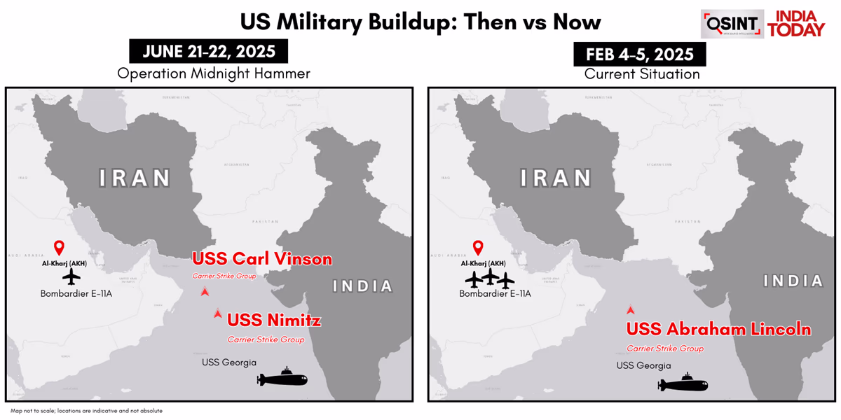 Sharing insights on X, Watkins suggested that this pattern might indicate an imminent attack. India Today's Open Source Intelligence (OSINT) team has mapped six E-11A BACN aircraft either stationed in the Middle East or on rotation. These deployments significantly boost U.S. command and control resources in the Gulf, aligning with former President Donald Trump's pressure on Iran's nuclear program and its crackdown on protestors in January.