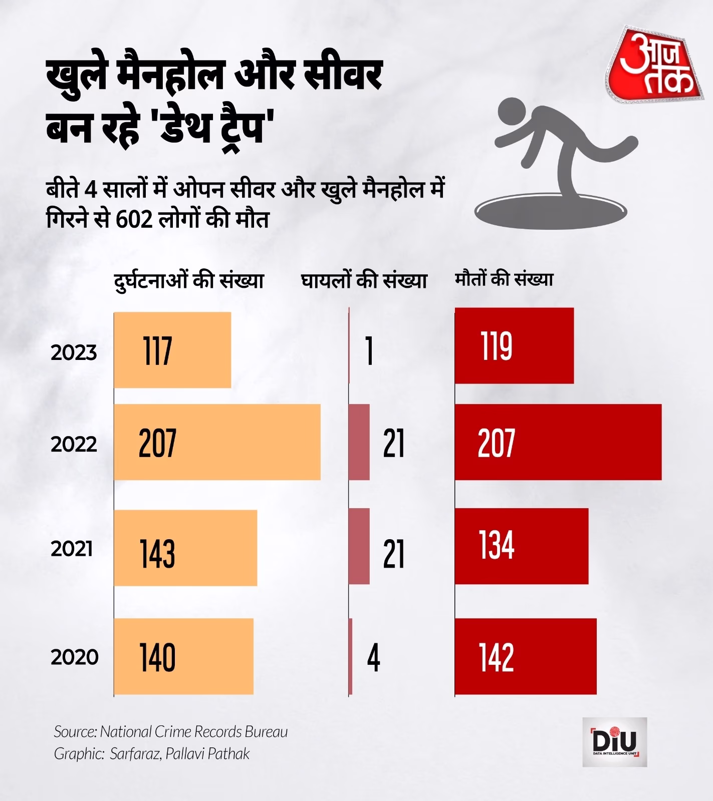 Alongside low visibility, open manholes and sewers pose significant threats to public safety. The National Crime Records Bureau reported 140 accidents and 142 deaths due to open manholes and sewers in 2020, and in 2021, 134 lives were lost in 143 accidents. The deadliest year was 2022 with 207 accidents and the same number of fatalities. Although the count of accidents decreased in 2023, the fatalities remain alarmingly high.