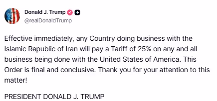 Trump declared that the United States will apply a 25% tariff on any country doing business with Iran to exert economic pressure. This announcement was shared on the social media platform, Truth Social.