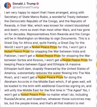 Nevertheless, Trump expressed skepticism about winning the Nobel Peace Prize. In a social media post, he proudly shared brokering a treaty between the Democratic Republic of Congo and the Republic of Rwanda with Secretary of State Marco Rubio, remarking on the significance for Africa and the world, yet expressing doubt about receiving the accolade.
