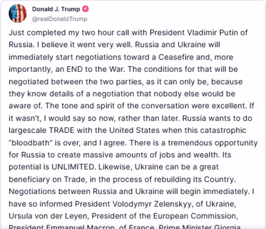 Trump reiterated that his conversation with President Putin spanned two hours and deemed it productive. Prospective ceasefire discussions will soon take place, potentially leading to conflict resolution. Matters of contention between both nations will be on the table. Trump remarked on Russia's eagerness for extensive trade relations with the U.S., envisioning future cooperation once peace is achieved.