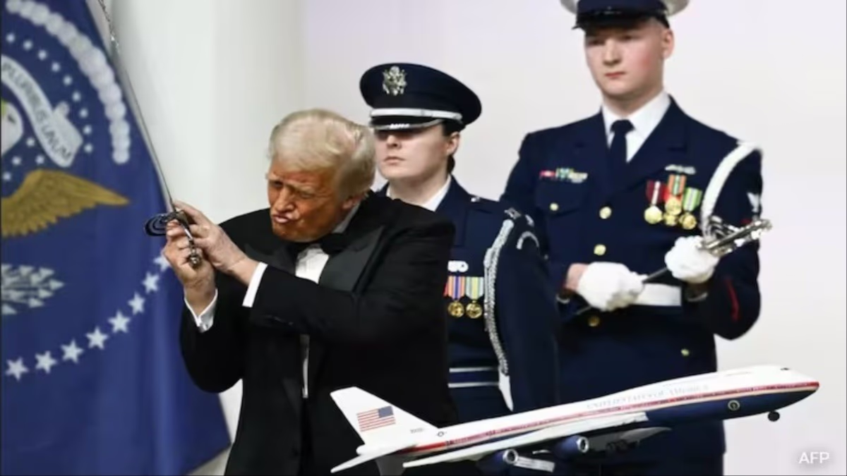 At the Commander in Chief Ball, Trump danced energetically with a military sword before cutting a massive cake adorned with insignias of American military branches. He used the sword to cut the cake. Joining him were his wife Melania Trump, Vice President JD Vance, and his wife Usha Vance.