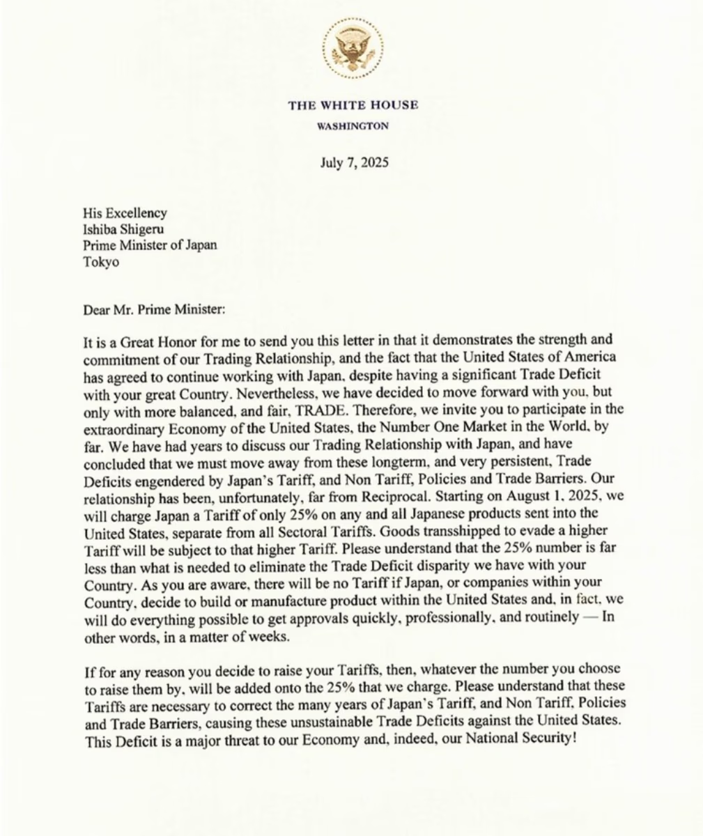 He continued in his tariff letter stating, beginning August 1, 2025, the US shall impose a distinct 25% tariff on any and all Japanese goods entering the United States.
