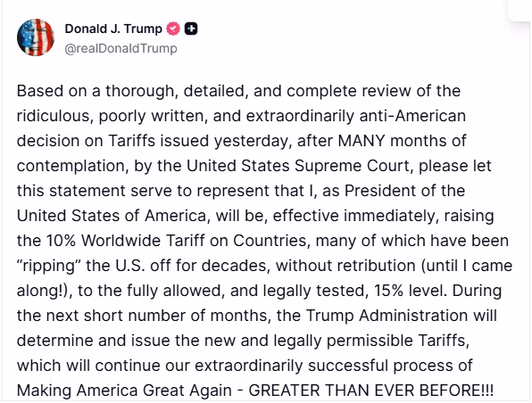 President Donald Trump has made a significant announcement regarding global tariffs. Through a social media post, Trump declared that the United States is set to increase the global tariff imposed on countries worldwide from 10% to 15% effective immediately. He stated that this decision is a response to several countries 'taking advantage' of the United States for decades.