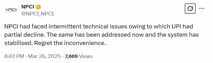 Users took to social media to express their grievances over the UPI outage. Numerous users wrote on X that UPI payments were repeatedly failing. The problems with UPI transactions began around 7 PM on Tuesday.