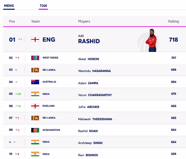 India's mystery spinner Varun Chakaravarthy has dazzled in the latest ICC (International Cricket Council) rankings announced on Wednesday. He has made an impressive jump of 25 places to become the number 1 T20 International format bowler. Meanwhile, England’s legendary leg-spinner Adil Rashid has reclaimed the throne as the number 1 bowler.