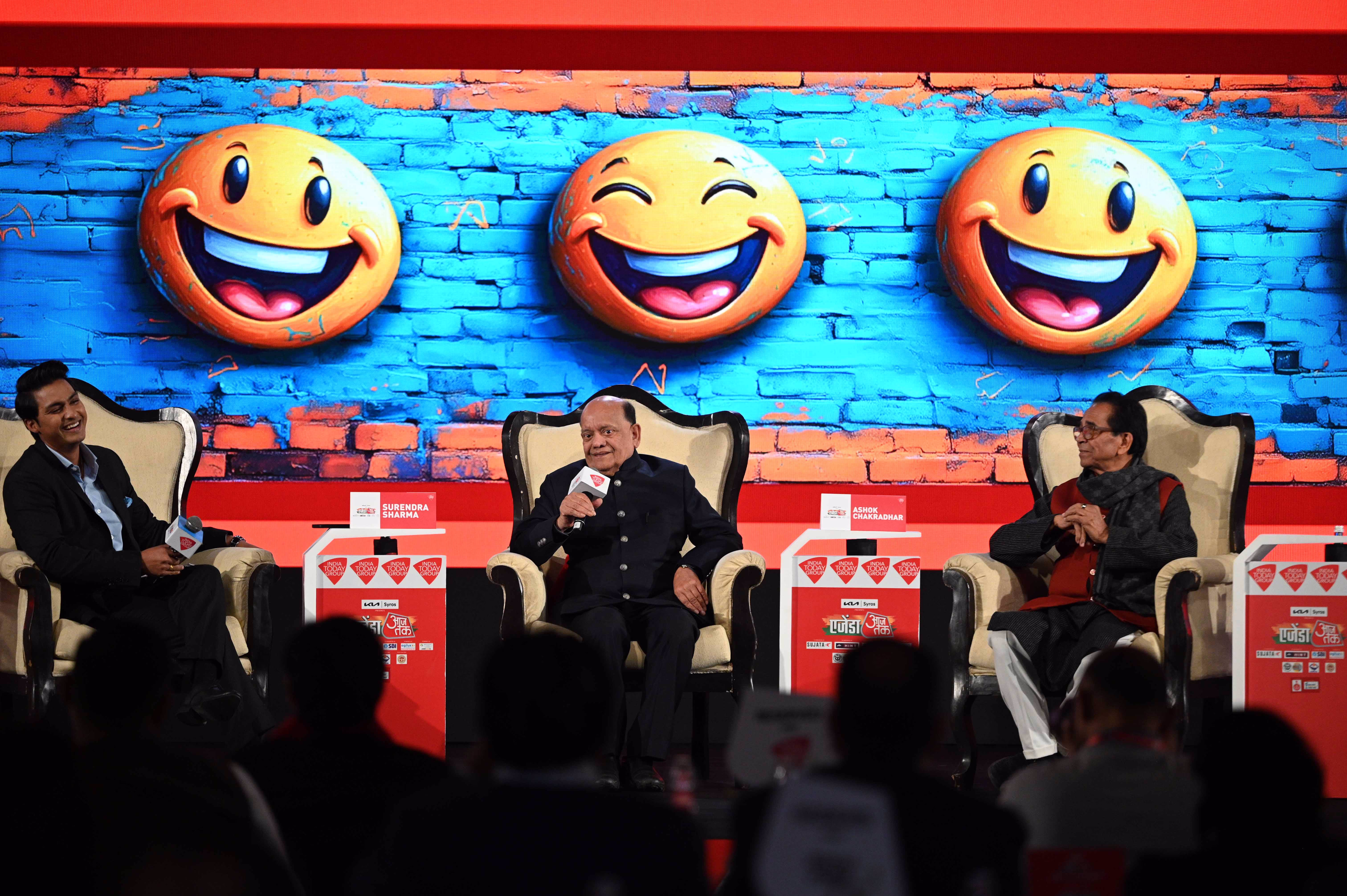 On the second day of Agenda AajTak's 'Laughter and Joy' session, poets Surendra Sharma and Ashok Chakradhar engaged in lively conversations filled with humor and depth. Responding to a query about reaching the audience, Surendra Sharma humorously remarked, "If I'm not asking for your trade secret, why reveal mine?" His witty response led to an outbreak of laughter across the auditorium.