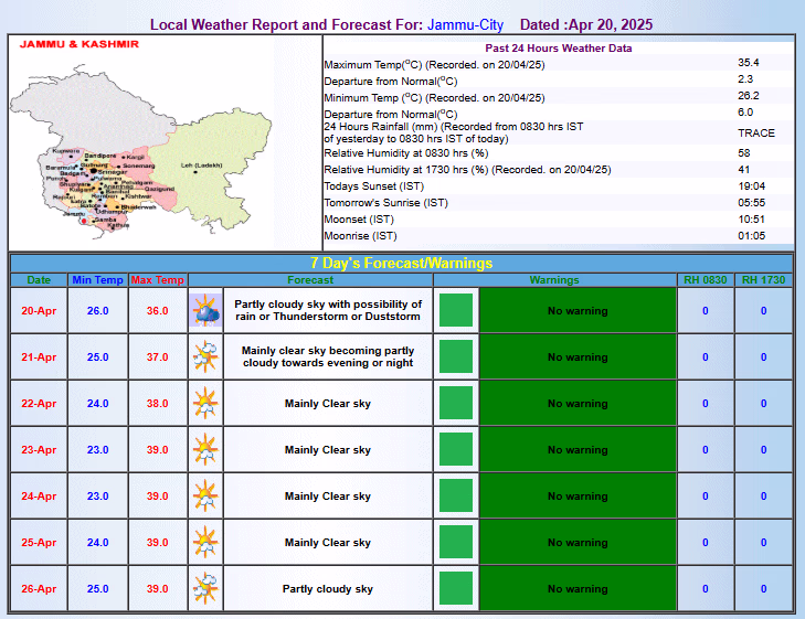 A flash flood wreaked havoc in Ramban, submerging the city. The chaos includes water, debris, and mud, with more than 30 homes damaged and vehicles trapped in silt. Partial cloud cover persists in Jammu today (April 21), with the potential for rain, thunderstorms, or dusty winds. By April 22, the sky should clear, although clouds may return by evening or night. No weather alerts have been issued by the authorities.