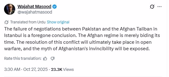 Senior Pakistani journalist Wajahat Masood wrote on X about the anticipated failure of the peace talks in Istanbul between Pakistan and the Afghan Taliban. He remarked, "The failure of the Pakistan-Afghan Taliban talks in Istanbul is a pre-determined conclusion. Afghan governance is merely waiting for the right moment. The resolution to this conflict will eventually unfold in open warfare, debunking the myth of Afghanistan's invincibility."