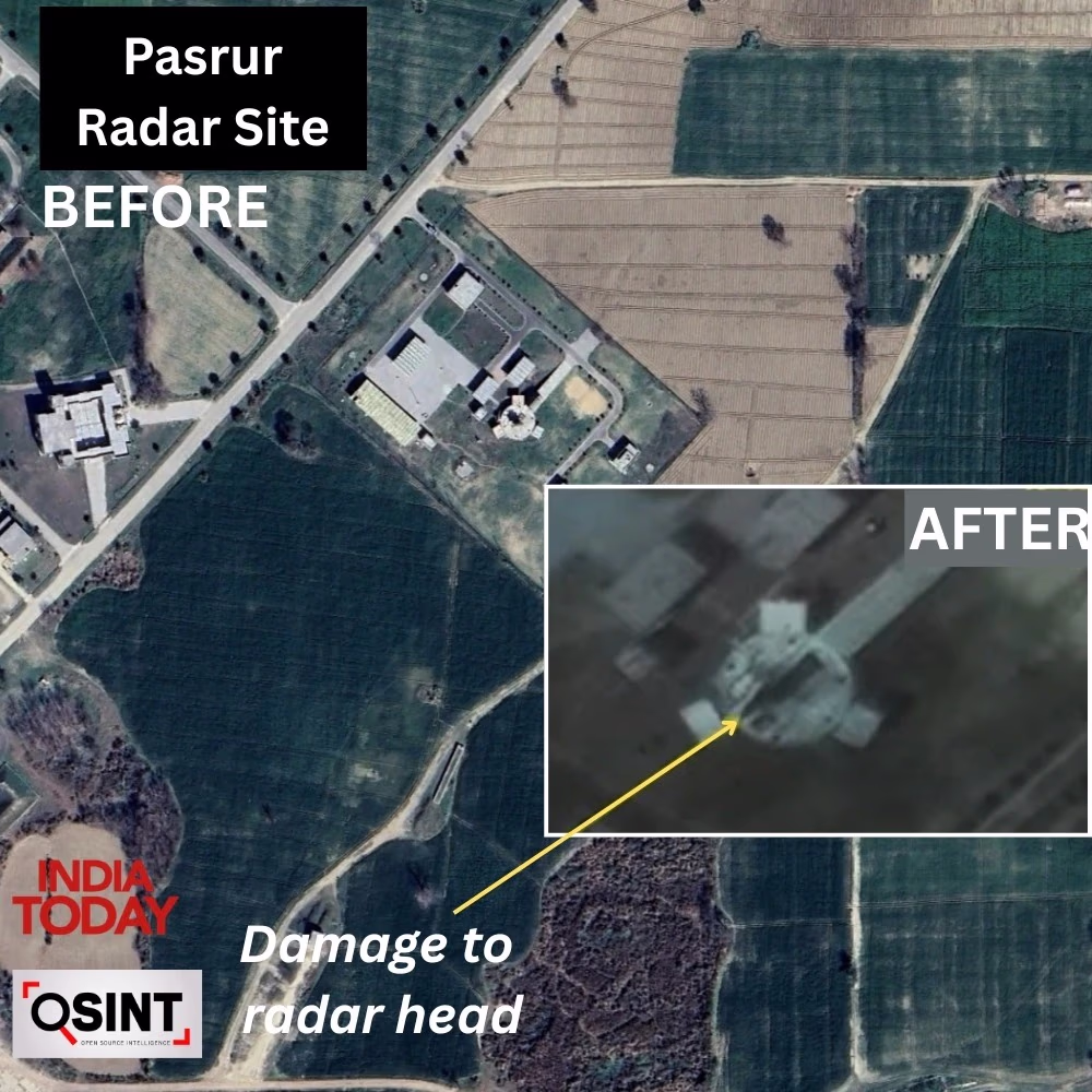 The Indian Armed Forces shared before-and-after images of Pakistani air defense radars demolished at Pasrur, Chunian, and Arifwala.