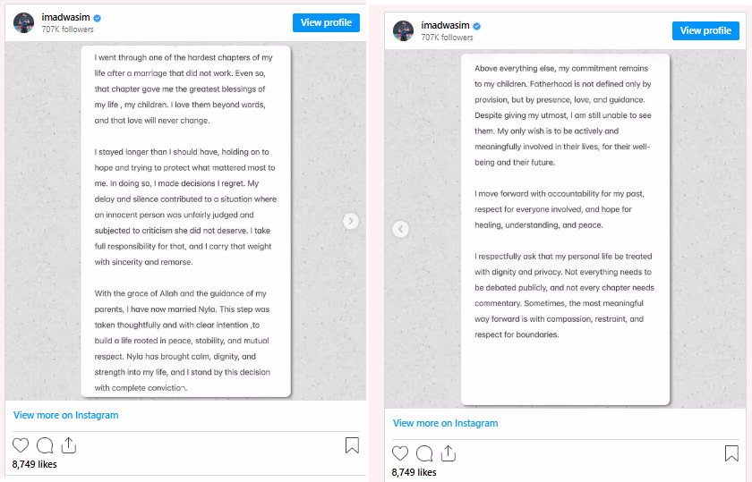 In the conclusion of his message, he appealed to people to respect his personal life and treat it with privacy and dignity. Imad wrote that not everything needs to be a topic of public debate, and sometimes, moving forward requires patience and sensitivity.