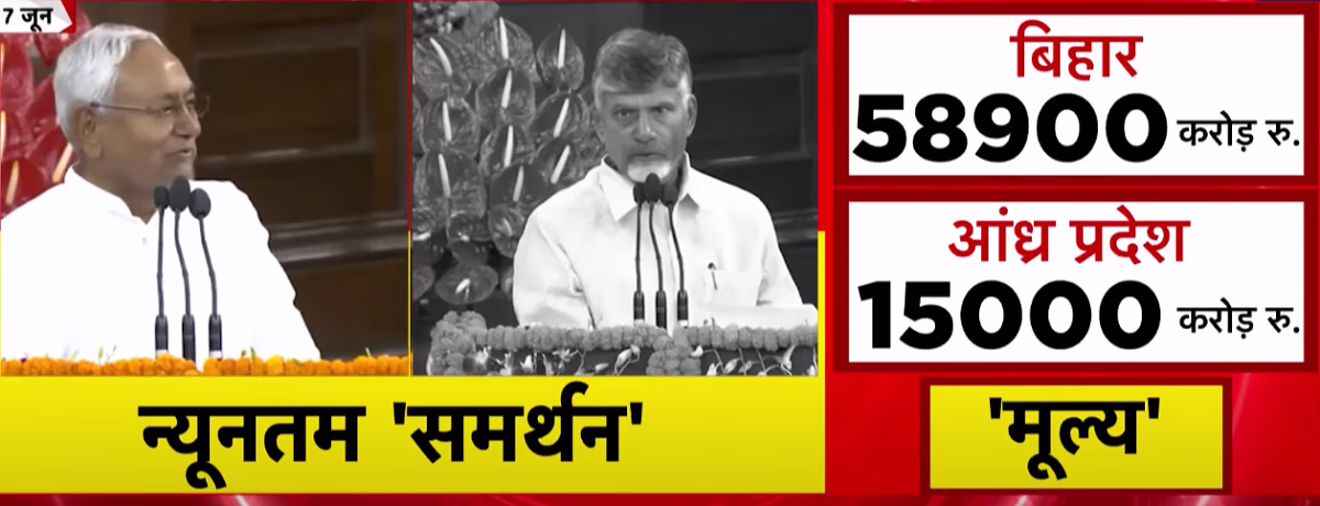 NDA currently holds 293 seats in the Lok Sabha, 21 more than the majority mark of 272. Among them, Nitish Kumar's JD(U) contributes 12 seats, and N. Chandrababu Naidu's TDP adds 16, totaling 28 seats. When combined with the support from 12 other smaller allies, this significant backing provides a robust political foundation. Accusations arise that these announcements are made to secure this majority, supported by the historical context of Nitish Kumar and Chandrababu Naidu.