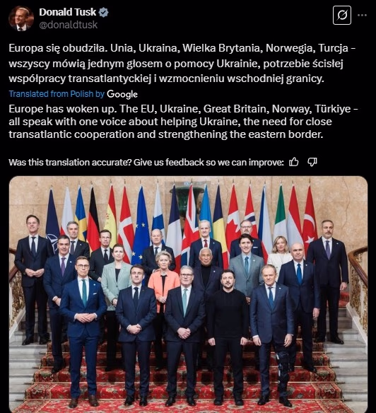 Following the breakdown in talks between Zelensky and Trump in Washington, NATO countries are convening in London to contemplate the Ukraine conflict. There, Donald Tusk acknowledged, 'Europe has woken up. The EU, Ukraine, the UK, Norway, and Turkey - they all speak in one voice about aiding Ukraine, the necessity for transatlantic cooperation, and fortifying the eastern border.'