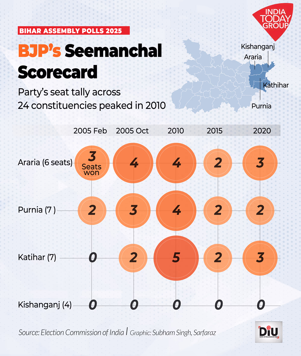 Kishanganj remains forbidden territory for the saffron party; from February 2005 to 2020, BJP hasn't gained a single seat there.