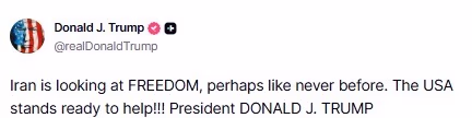 On his platform, Truth Social, Trump proclaimed, 'Iran is yearning for freedom. Perhaps like never before. America is ready to help.' These words spark speculation about a potential U.S. military intervention against the Khamenei government in Iran.
