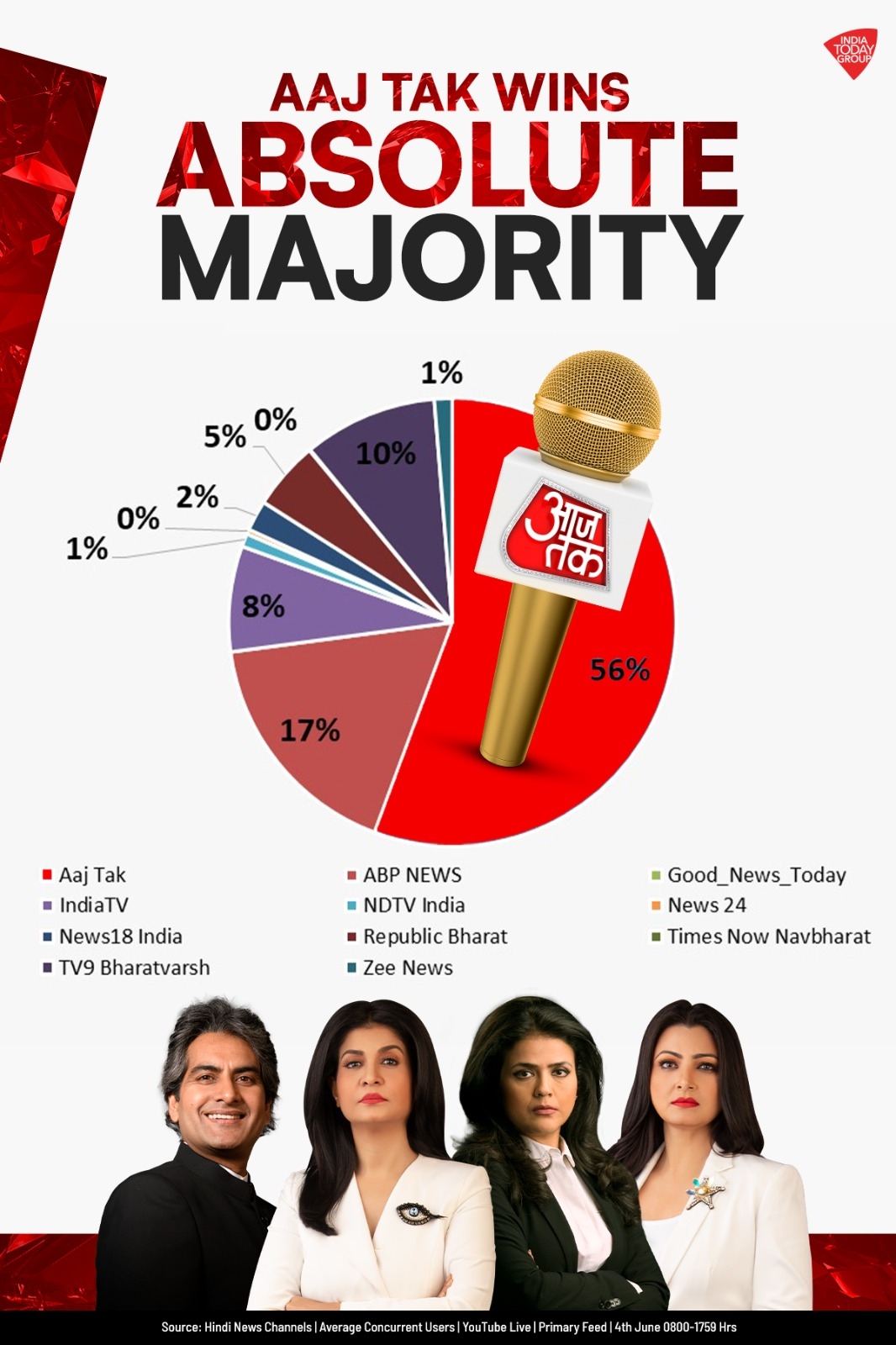 On the day of the 2024 Lok Sabha election results, the world's eyes were on India. On Tuesday, June 4th, as everyone eagerly awaited the largest democracy's mandate, over half of those viewers (exceeding 50 percent) were tuned into Aaj Tak. The channel's longstanding credibility with audiences in India and across the globe has once again led it to set a new milestone in viewership.