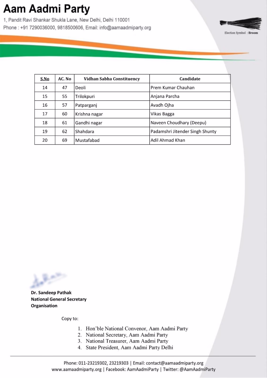The candidates in the first list included Brahm Singh Tanwar from Chhatarpur, Anil Jha from Kirari, Deepak Singhla from Vishwas Nagar, Sarita Singh from Rohtas Nagar, BB Tyagi from Laxmi Nagar, Ram Singh from Badarpur, Zuber Chaudhary from Seelampur, Veer Singh Dheengan from Seemapuri, Gaurav Sharma from Ghonda, Manoj Tyagi from Karawal Nagar, and Sumesh Shaukeen from Matiala.